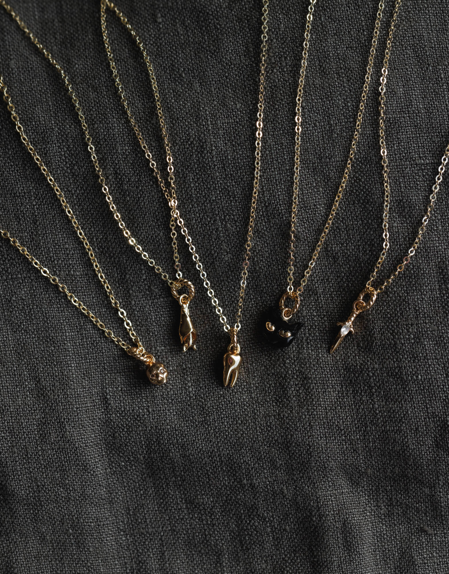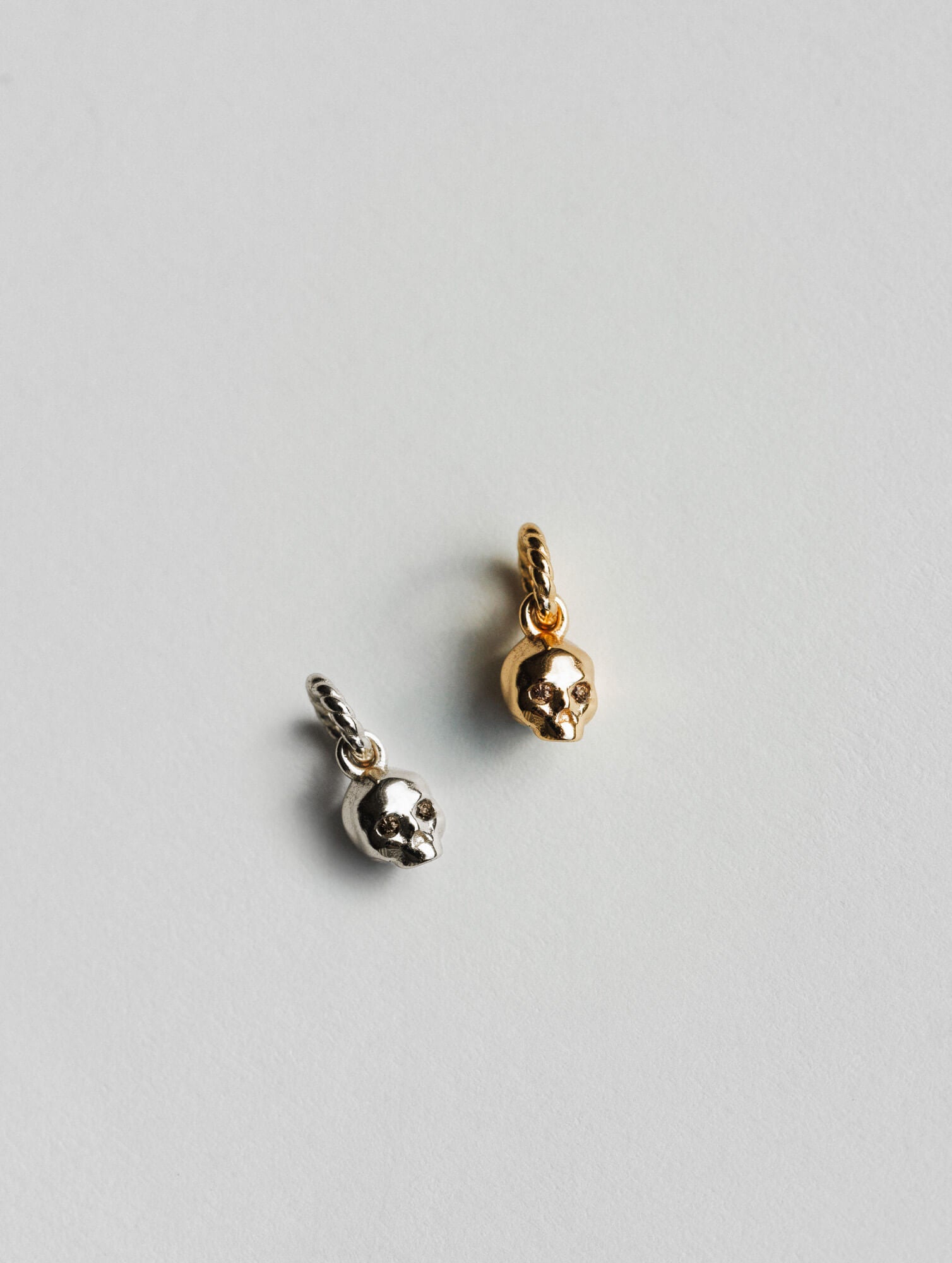 See beyond the veil with the tiniest skull charm set with mahogany gemstone eyes, available here as an add-on or paired with a few of our favorite chains.